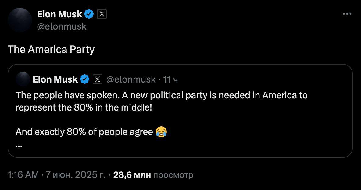 За словами Маска, проведене на платформі X опитування показало високу підтримку ініціативи — близько 80% користувачів висловилося за створення такої партії.