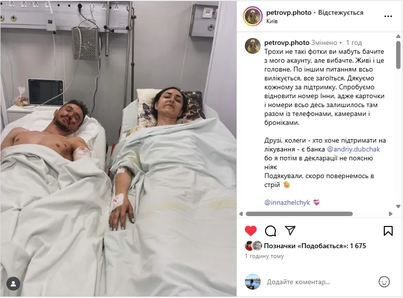 "Трохи не такі фото ви, мабуть, звикли бачити з мого акаунту, але вибачте. Живі – і це головне. Щодо інших питань все вилікується, все загоїться. Дякуємо кожному за підтримку. Спробуємо відновити номер Інни, адже картки та номери десь залишилися там разом із телефонами, камерами та бронежилетами", – написав Петров.