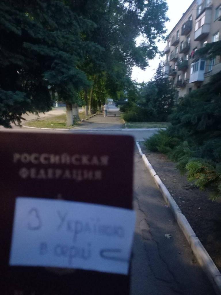 Учасники руху «Жовта стрічка» повідомили про нову акцію спротиву в окупованих регіонах Луганської та Донецької областей. Люди вийшли з патріотичними написами на російських паспортах, щоб нагадати: Донбас - це Україна.