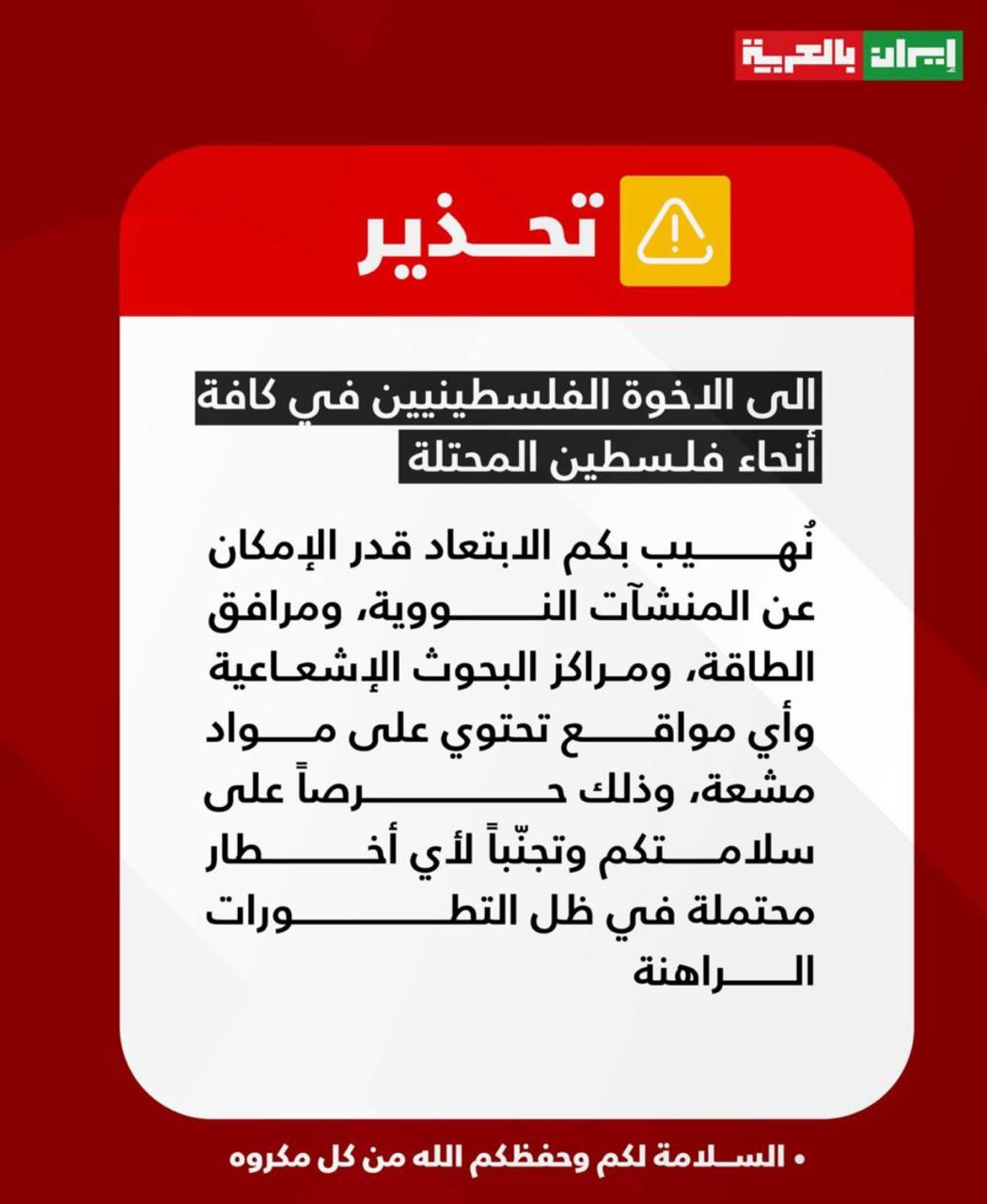 Іран звернувся до палестинців із проханням уникати ізраїльських об’єктів, які становлять ядерну та радіаційну загрозу. У заяві акцентується увага на тому, що це необхідно «заради власної безпеки» в умовах ймовірного серйозного загострення.