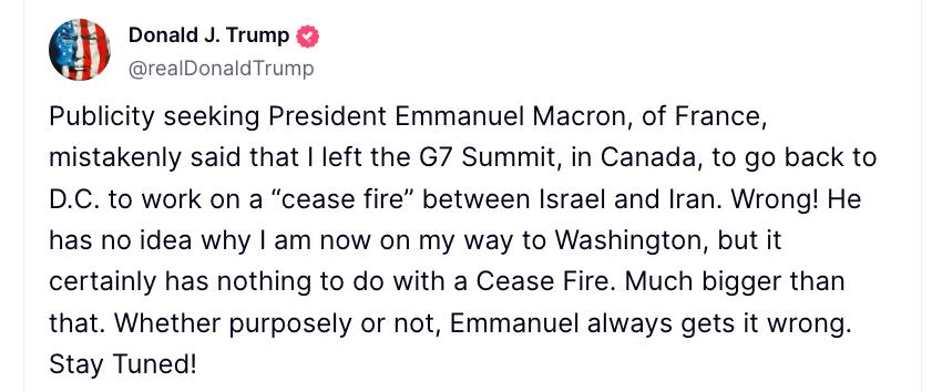 «Жадібний до уваги президент Франції помилково заявив, що я поїхав із саміту, щоб працювати над врегулюванням конфлікту між Ізраїлем та Іраном. Це неправда! Макрон не знає, чому я прямував у Вашингтон, але це точно не пов’язано з припиненням вогню. Справа куди серйозніша. Чи то свідомо, чи ні — Емманюель постійно плутається. Слідкуйте за новинами!» — написав Трамп у соцмережі.