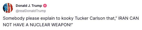 У своєму дописі в Truth Social Трамп заявив, що «хтось має пояснити звихнутому Карлсону, що Іран не може мати ядерної зброї».