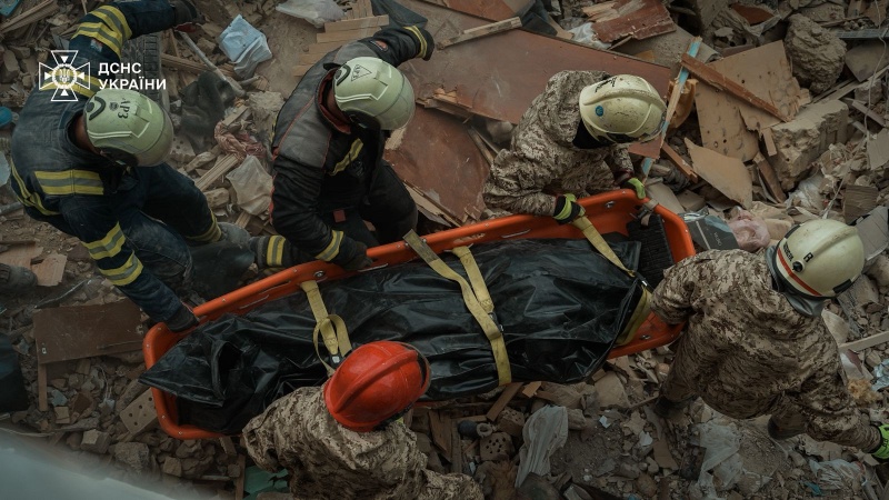 За даними рятувальників, станом на 19:50 у Солом’янському районі за адресою: бульвар Вацлава Гавела, з-під завалів дев’ятиповерхового будинку деблокували тіло одного загиблого.