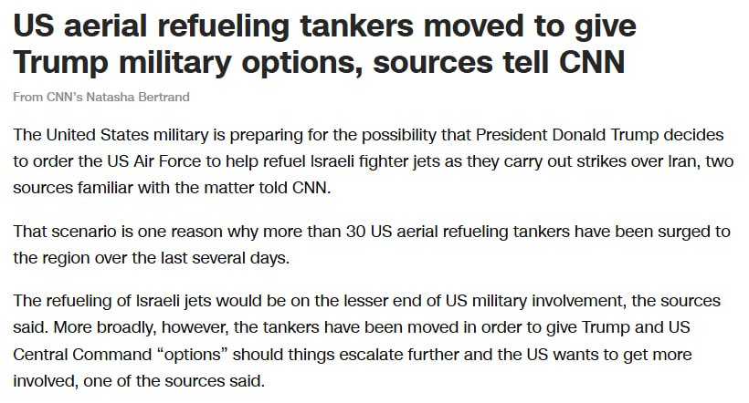 Також, згідно з інформацією CNN, американські військові готуються до того, що президент Трамп може віддати команду ВПС на дозаправлення ізраїльських винищувачів під час атак на Іран.