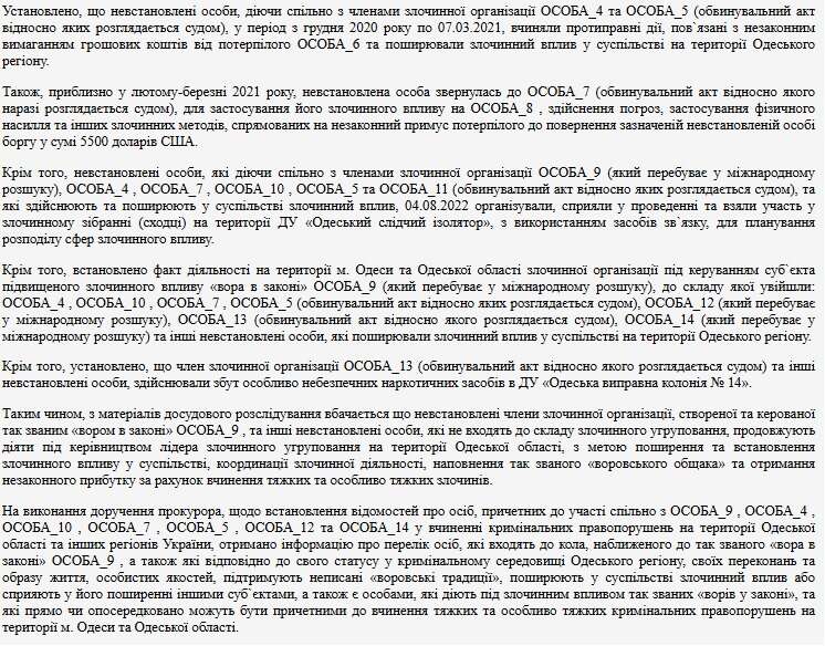 Згідно з первинною кваліфікацією справи, провадження стосується створення/діяльності ОЗУ (ч.5 ст.255 КК України), звернень та поширення злочинного впливу в установах неволі (ч.1 ст.255-3 КК України та ч.1 ст.255-2 КК України), а також розповсюдження наркотиків (ч.2, ч.3 ст.307 КК України).