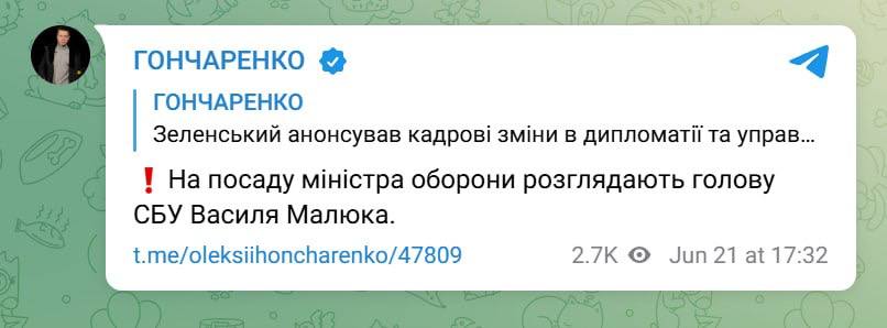 На посаду міністра оборони розглядають голову СБУ Малюка.