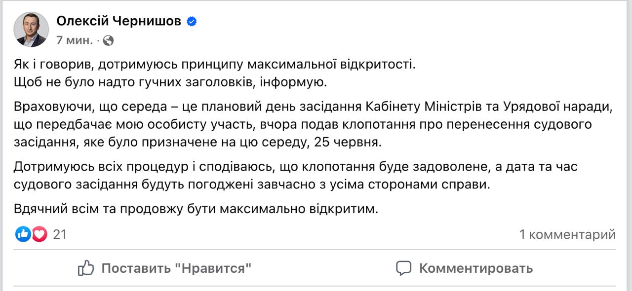 "Враховуючи, що середа - це плановий день засідання Кабінету Міністрів та урядової наради, що передбачає мою особисту участь, вчора подав клопотання про перенесення судового засідання, яке було призначене на цю середу, 25 червня", - написав Чернишов на своїй сторінці у Facebook.