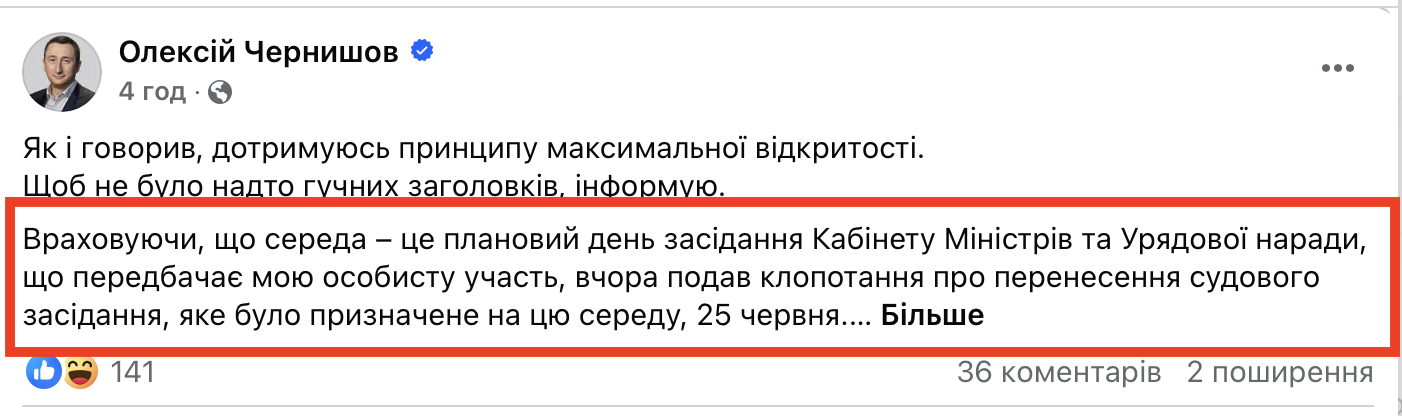 Далі. Засідання Вищого антикорупційного суду (ВАКС), призначене на сьогодні, Чернишов ігнорує. Каже, що попросив перенести, бо треба було відвідати засідання уряду.
