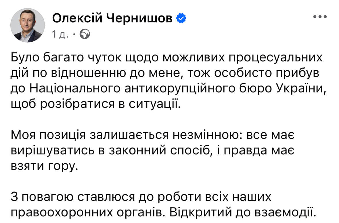 Далі міністр їде в НАБУ і публікує допис: "Було багато чуток щодо можливих процесуальних дій стосовно мене, тож особисто прибув до Національного антикорупційного бюро України, щоб розібратися в ситуації".