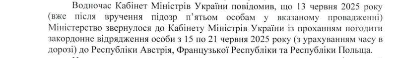 "Водночас Кабінет Міністрів України повідомив, що 13 червня 2025 року (вже після вручення підозр п’ятьом особам у вказаному провадженні) Міністерство звернулося до Кабінету Міністрів України із проханням погодити закордонне відрядження особи з 15 по 21 червня 2025 року (з урахуванням часу в дорозі) до Республіки Австрія, Французької Республіки та Республіки Польща".