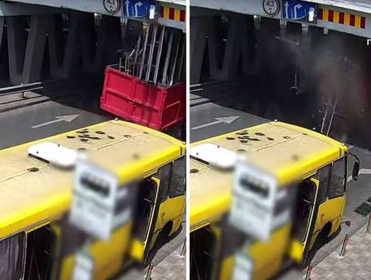 На кадрах видно, як фура намагається проїхати під мостом, однак не враховує обмеження за висотою. Хоча на місці є відповідний дорожній знак, ймовірно, водій або не звернув на нього уваги, або переоцінив можливості свого авто. Унаслідок удару пошкоджено частину інфраструктури.