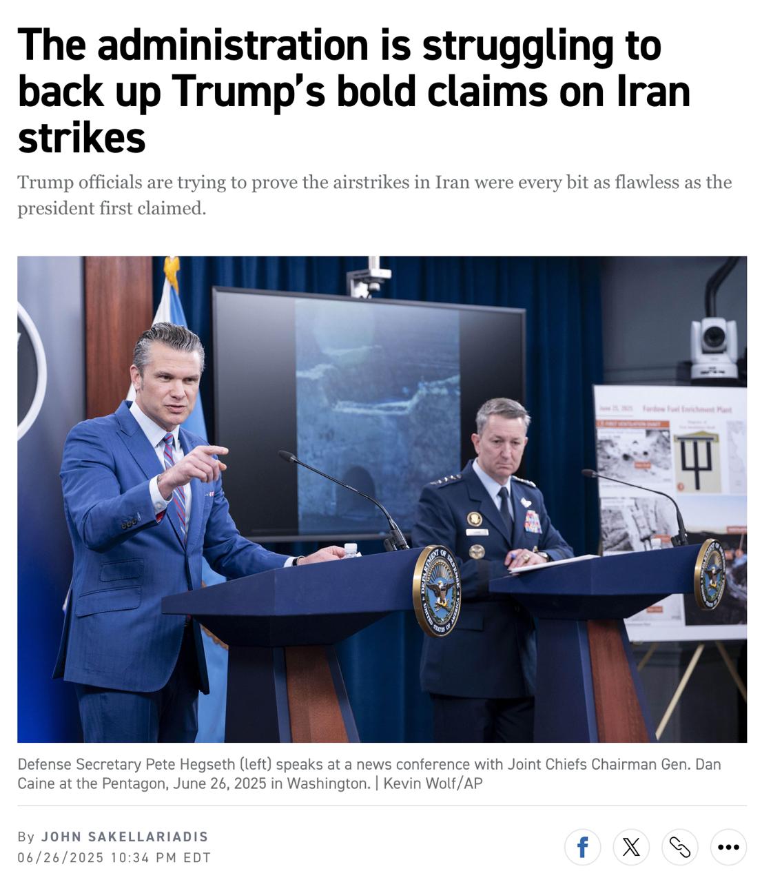 Згідно з оцінкою видання, на остаточне визначення масштабів руйнувань піде кілька тижнів або навіть місяців. Представники адміністрації Трампа самі визнають, що поки занадто рано робити висновки про результати ударів — «хоча саме це вони і намагаються зробити».