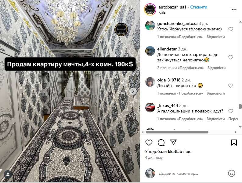 "Яка ступінь шизофренії у власника? А куди господарі переїхали? До божевільні? Епілепсія через 3…2…1", — поділилися підписники сторінки враженнями в коментарях.