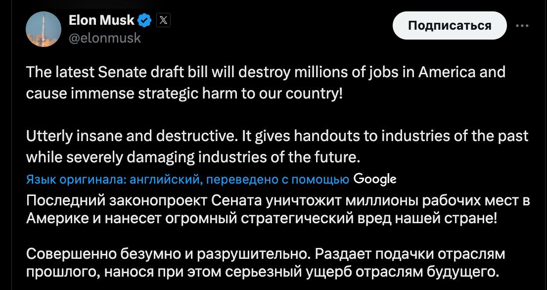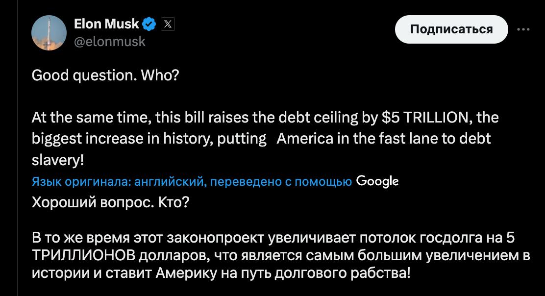 Ілон Маск назвав скандальний законопроєкт Сенату «борговим рабством» і «самогубством Республіканської партії»