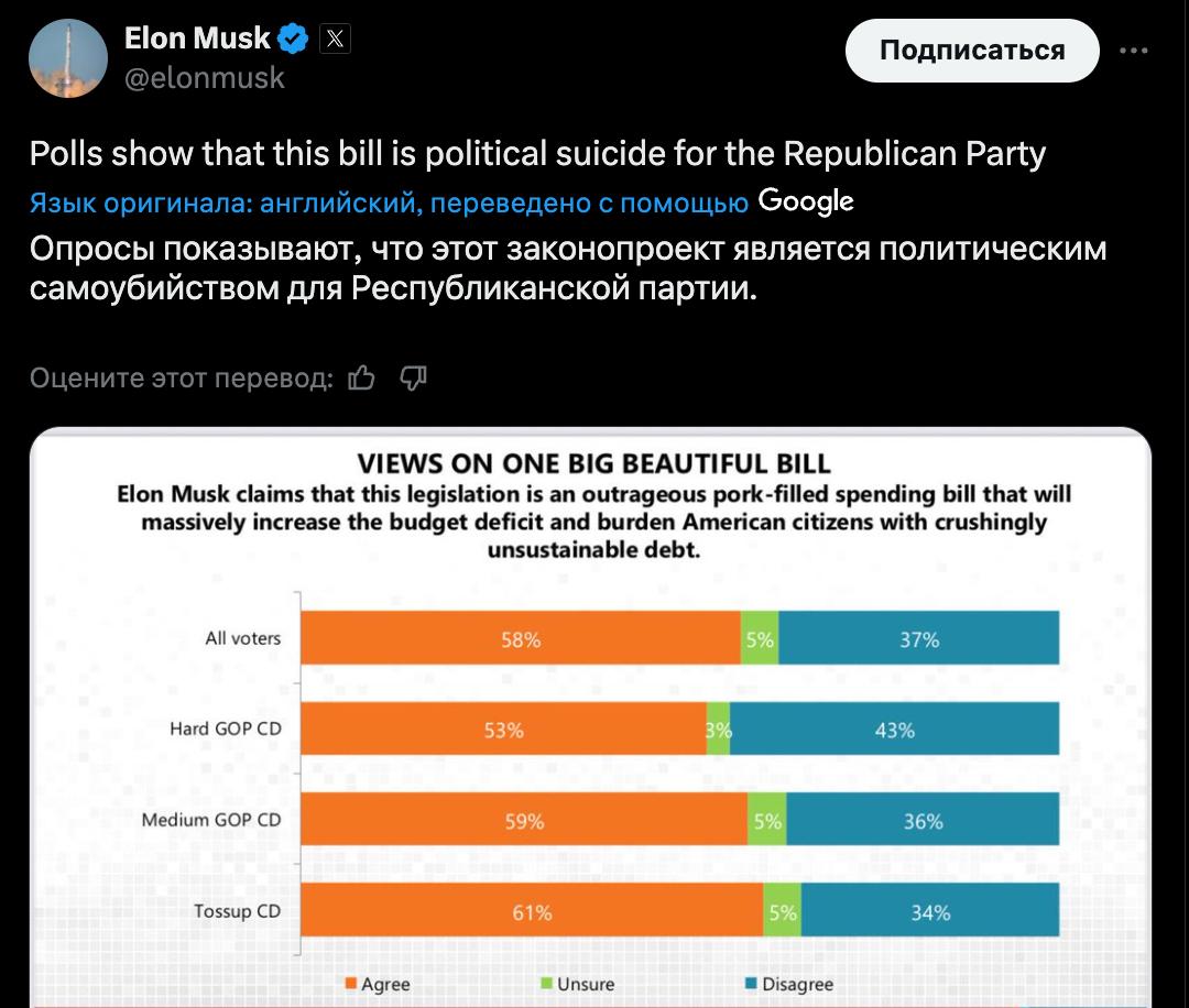 Крім того, Маск попередив про політичні наслідки ухвалення закону, заявивши, що «опитування свідчать — це політичне самогубство для Республіканської партії».