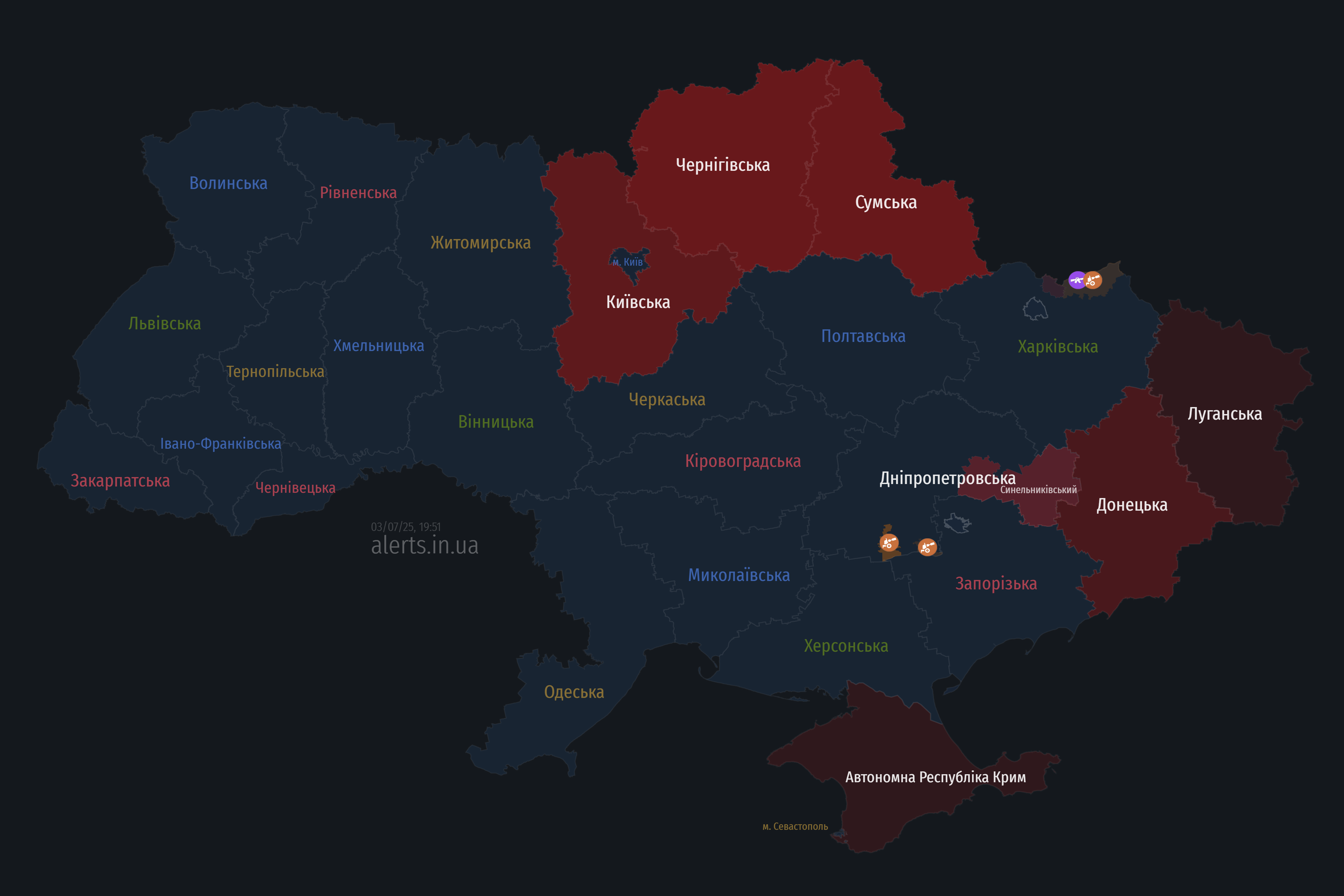 Станом на зараз мапа повітряних тривог має такий вигляд: