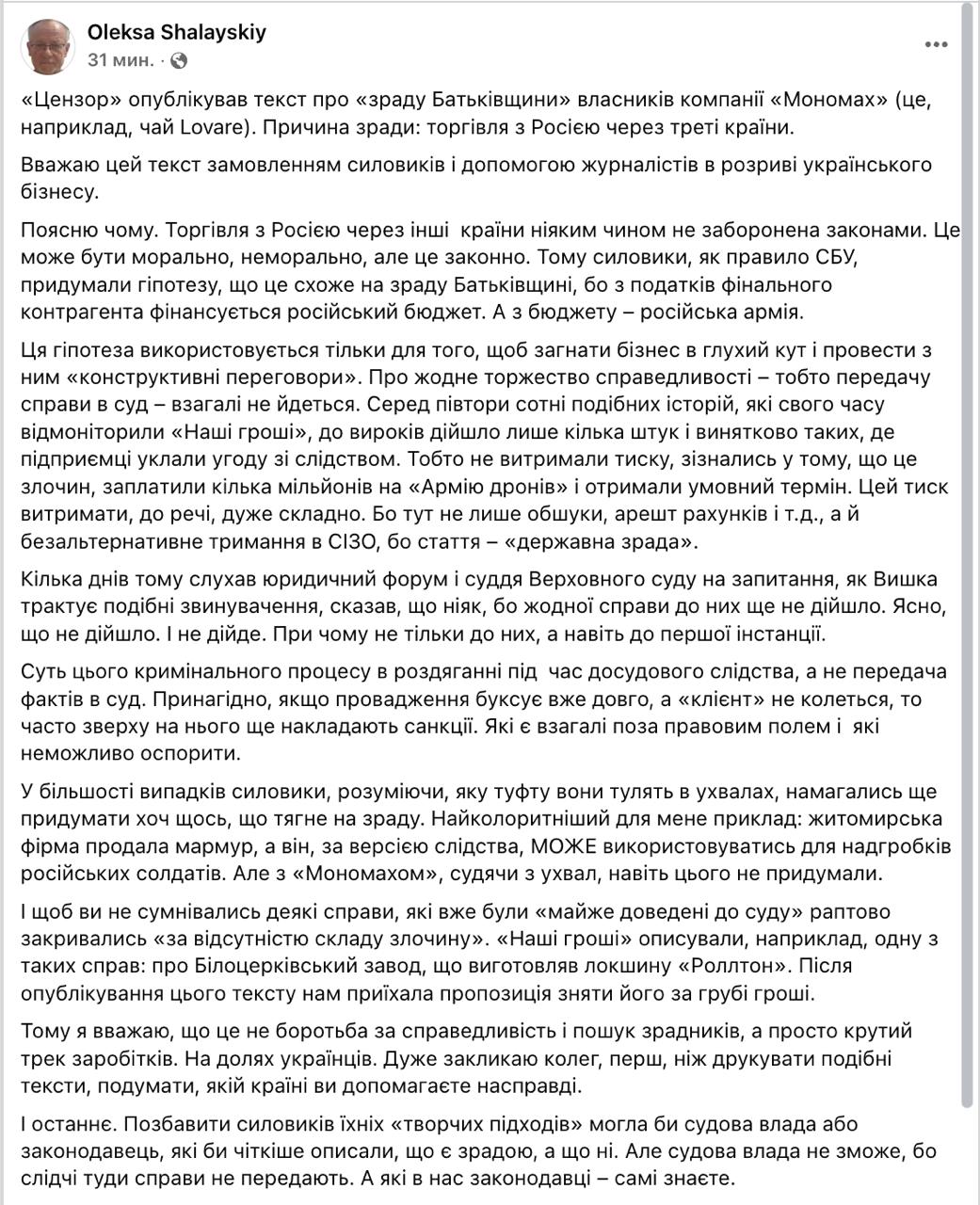 «Ця гіпотеза використовується лише для того, щоб загнати бізнес у глухий кут і провести з ним «конструктивні переговори». Ні про яке свято справедливості – тобто, передачу справи до суду – взагалі не йдеться. З півтори сотні подібних випадків, які були відстежені «Нашими грошима», до вироків дійшло лише кілька, і тільки в тих, де підприємці пішли на угоду зі слідством. Тобто, не витримали тиску, зізналися у скоєнні злочину, заплатили кілька мільйонів на «Армію дронів» і отримали умовні терміни. Витримати такий тиск, до речі, дуже складно. Бо тут не тільки обшуки, арешт рахунків і т.д., але й безальтернативне утримання в СІЗО, адже стаття – «державна зрада», - пише Шалайський.