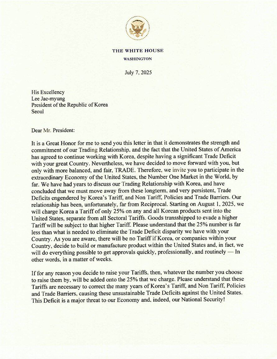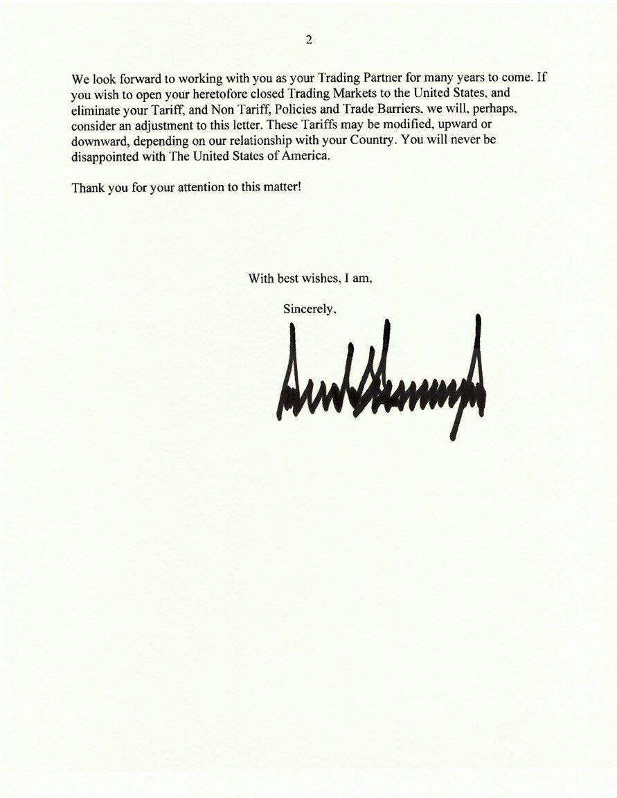 "Ми зобов’язані покласти край торговим дефіцитам, викликаним тарифними та нетарифними бар’єрами цих держав… У зв’язку з цим, ми встановлюємо 25% мито на всі товари, що надходять", – йдеться в листах, надісланих керівництву обох азійських країн.