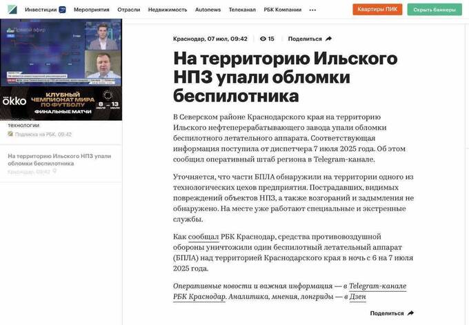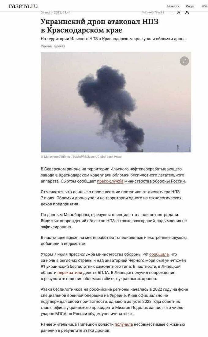 У понеділок, 7 липня, українські далекобійні безпілотники завдали удару по Ільському нафтопереробному заводу імені А. Шамара в Краснодарському краї (РФ).