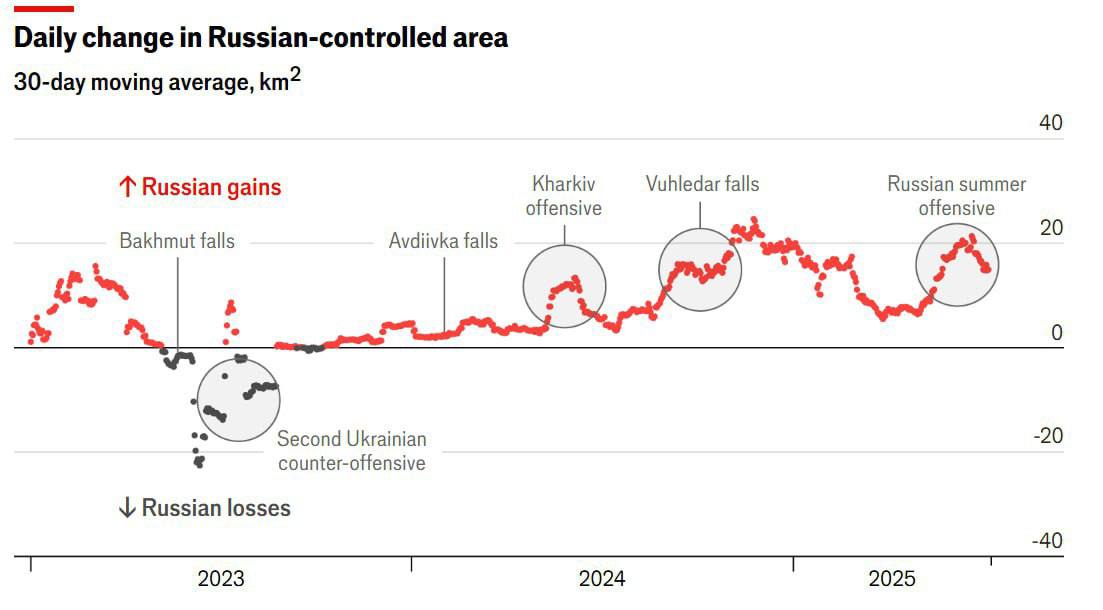 За даними видання, на цей момент противник просувається локально приблизно на 0,05 км² на день в окремих регіонах, таких як Сумська та Донецька області, проте про який-небудь "стратегічний перелом" поки говорити не доводиться.