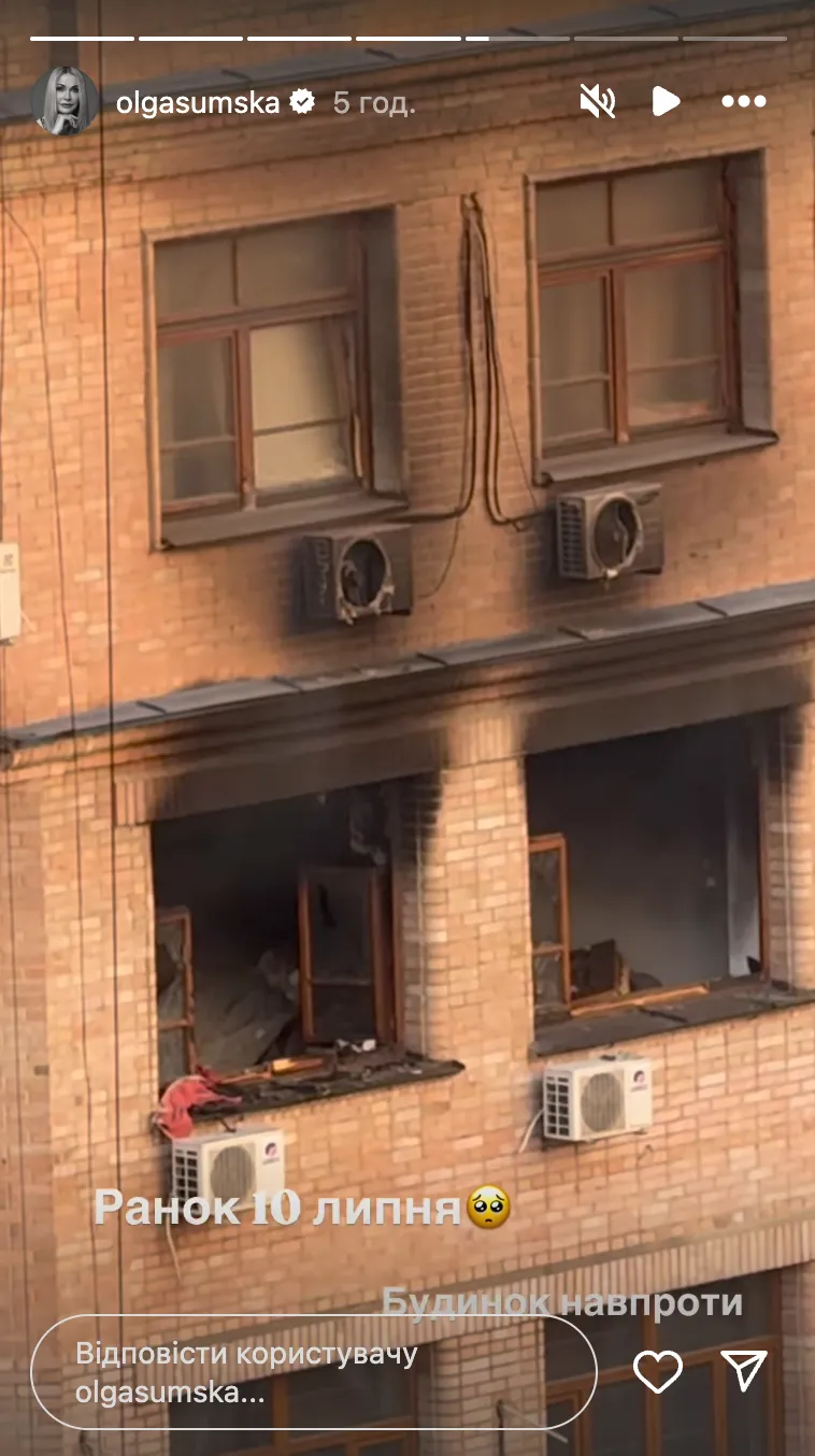 Зранку Ольга опублікувала кадри будинку навпроти. У сусідів вибиті шибки, на стінах видно чорні сліди від вогню.