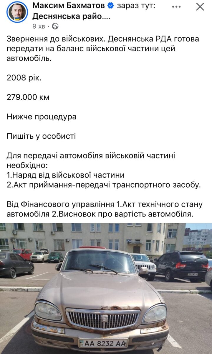 Голова Деснянської районної державної адміністрації Києва Максим Бахматов висловив готовність передати іржаву “волгу” на баланс військової частини.