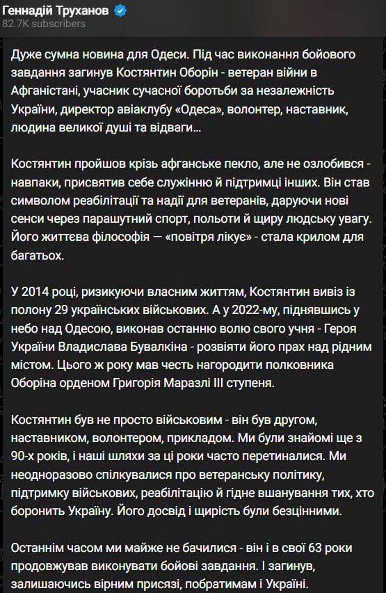 Під час виконання бойового завдання загинув український льотчик, голова авіаклубу "Одеса" Костянтин Оборін.