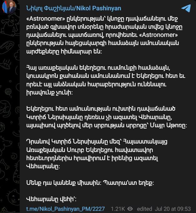 Це звернення пролунало після того, як раніше Пашинян назвав Гарегіна ІІ «антихристом» і пообіцяв очолити «звільнення» церкви від нього. Ситуація свідчить про загострення конфлікту між державною владою і духовенством у Вірменії.