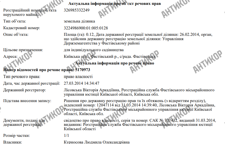Згідно з даними Реєстру речових прав у тому ж 2014 році у дружини Яна Стрелюка Людмили Курносової з’явилась земельна ділянка у Фастівському районі Київської області, що розташована поруч із Васильківщиною.