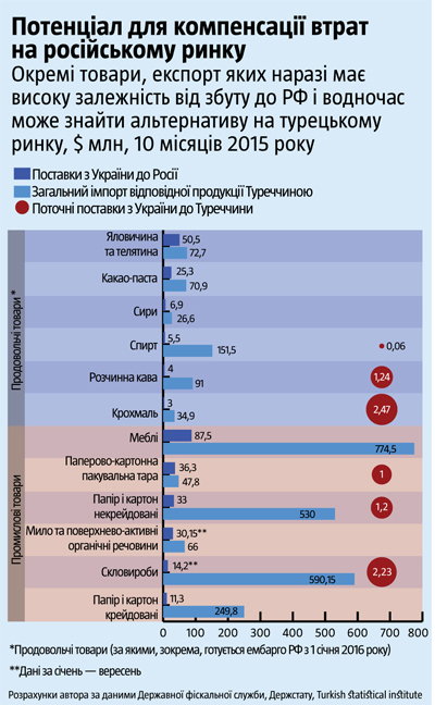 Прежде всего речь идет о говядине, украинские производители которой (как и производители свинины) больше всего пострадают от возможного российского продуктового эмбарго. Наш экспорт этой продукции в РФ за 10 месяцев в 2015 году составил $50,5 млн. А Турция за то же время импортировала ее на $72,7 млн. Речь идет также о значительных объемах турецкого импорта бытовой химии, в частности мыла и поверхностно-активных веществ, мебели, керамической продукции, бумаги и картона, упаковочной тары из них, стеклоизделий и т. п. Их совокупные объемы в разы, а то и на порядок превышают нынешние поставки соответствующей продукции на российский рынок. Но в то же время украинские производители в большинстве случаев совсем не используют возможностей турецкого рынка