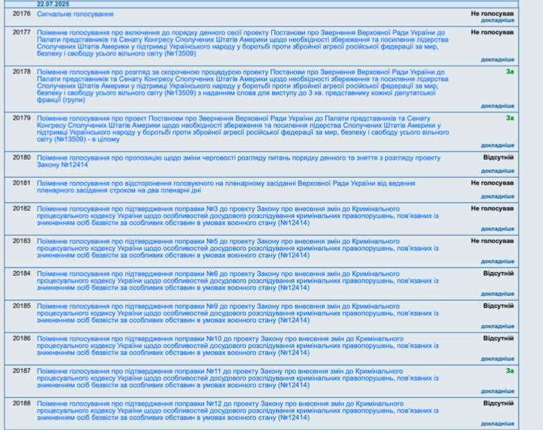 Скриншот голосувань Миколи Тищенка протягом 22 липня 2025 року на сайті Верховної Ради УкраїниСеред відсутніх депутатів з підозрами пʼятеро — це ті, хто перебуває у СІЗО (Олександр Дубінський, Олександр Пономарьов, Євгеній Шевченко, Нестор Шуфрич та Віктор Бондар), а також ще четверо, які переховуються закордоном (Артем Дмитрук, Ярослав Дубневич, Федір Христенко, Сергій Шахов).