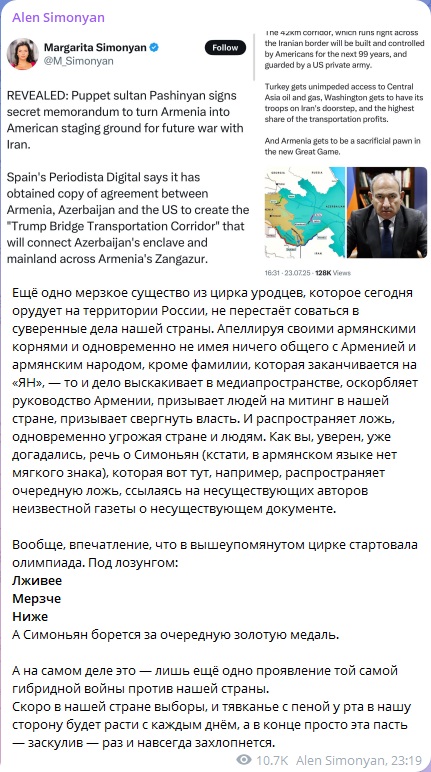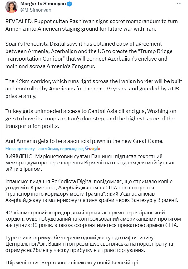 Маргарита Симоньян послалася у своєму пості на статтю іспанського видання Periodista Digital, у якій стверджувалося, що завдяки вірменській діаспорі у Франції редакція отримала конфіденційний документ під назвою "Меморандум про взаєморозуміння щодо створення транспортного коридору через міст Трампа". І нібито цей документ вже був схвалений Вірменією, Азербайджаном і США.