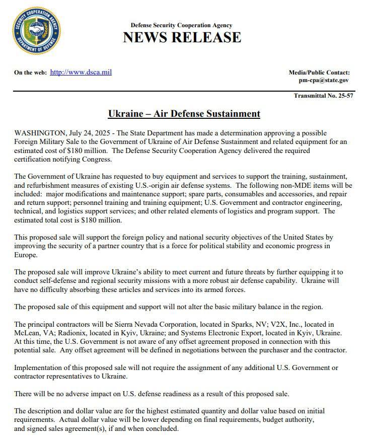 Агентство з оборонного співробітництва США повідомило про схвалення постачання Україні обладнання для забезпечення роботи систем протиповітряної оборони на суму 180 мільйонів доларів.