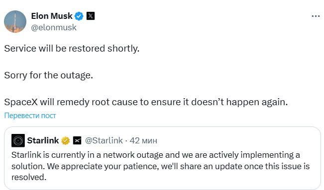 Ілон Маск пообіцяв незабаром усунути перебої в роботі інтернету Starlink