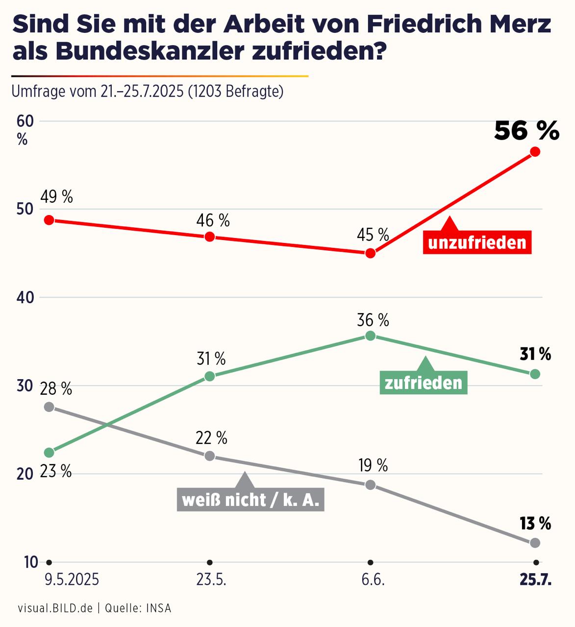 56% німців висловили невдоволення роботою лідера ХДС Фрідріха Мерца, повідомляє Bild з посиланням на дані соціологічної компанії INSA.