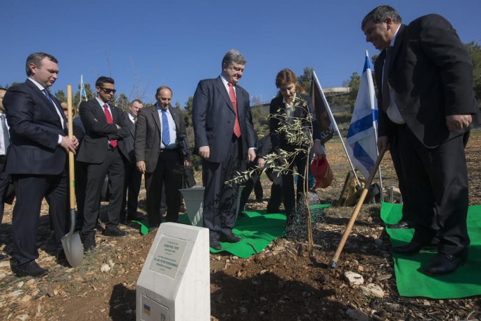 После переговоров с руководством Израиля Петр Порошенко вместе с супругой посетили Мемориальный комплекс Холокоста “Яд Вашем”. На территории Мемориального комплекса президентская чета посадила оливковое дерево для Украинской рощи.