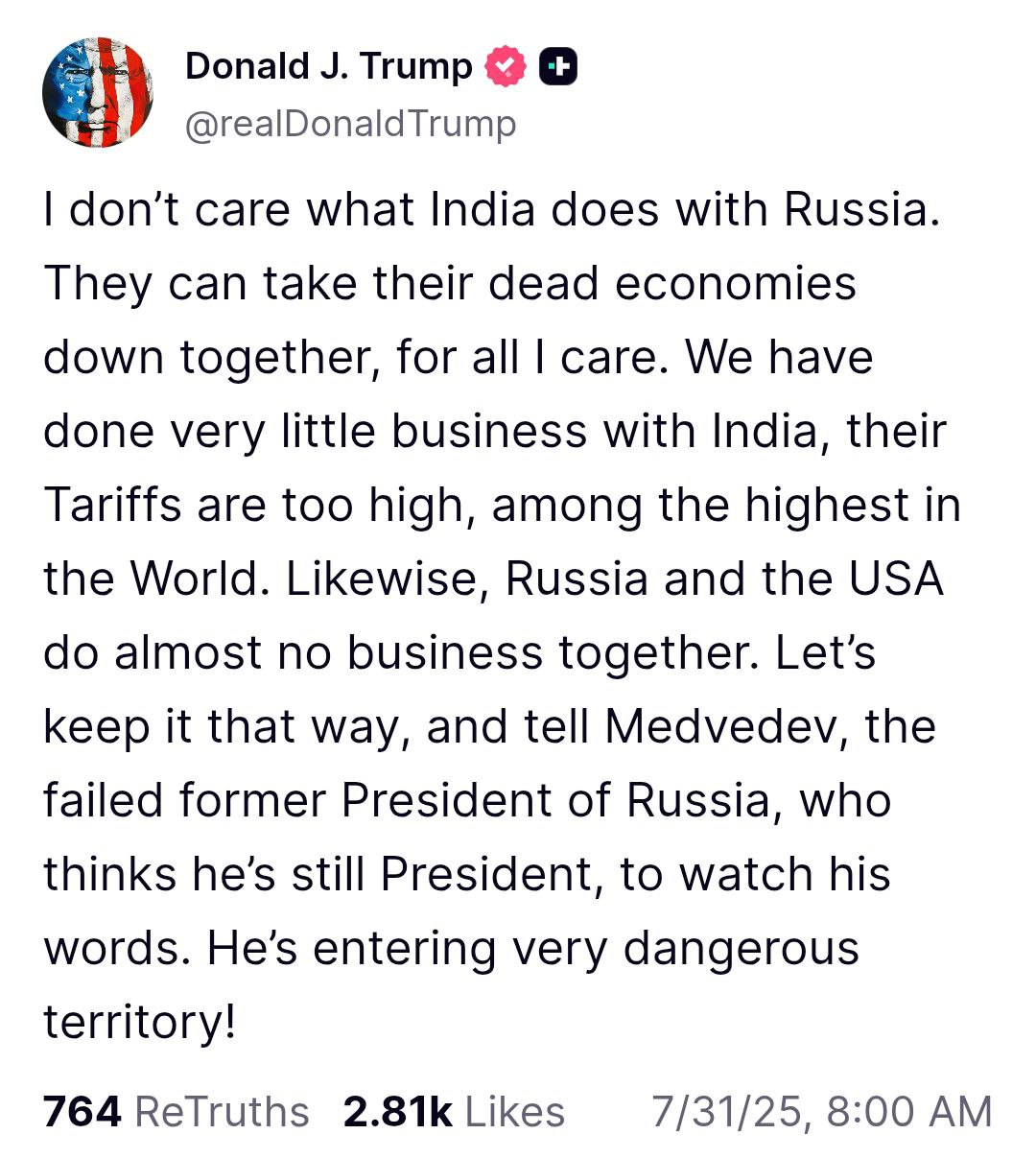 "Мені все одно, що Індія робить з Росією. Якщо хочуть — нехай разом тягнуть свої мертві економіки на дно. Ми і так майже не мали справ з Індією — у них занадто високі тарифи, одні з найвищих у світі. Точно так само Росія і США майже не ведуть бізнес між собою. Давайте залишимо все, як є", - написав Трамп.