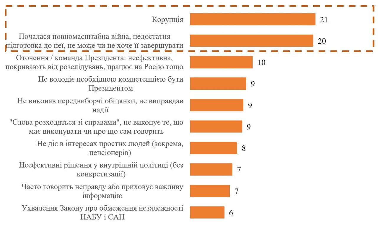 Основною причиною недовіри, як зазначили респонденти, є корупція (21%), на другому місці - причини, пов’язані з війною: «почалася війна, недостатня підготовка до неї, не може або не хоче її завершити» - 20%.