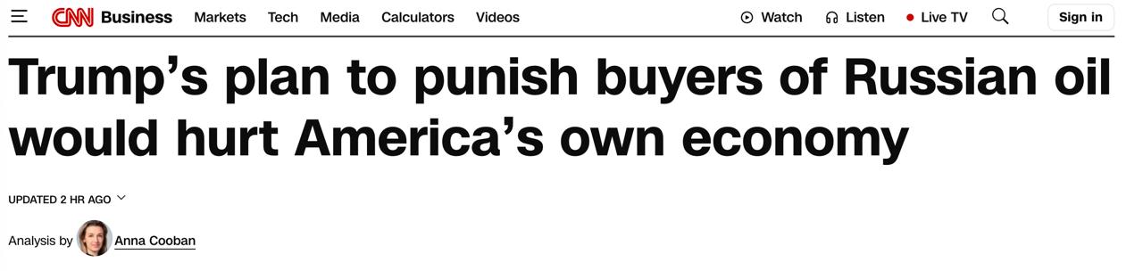 «Якщо мир в Україні ще досі здається малоймовірним, а Трамп вирішить реалізувати свій план, то нова дубина може вдарити по самій американській економіці — через вищі ціни на споживчі товари, зниження рентабельності американських компаній і можливе підвищення цін на нафту», - йдеться в статті.