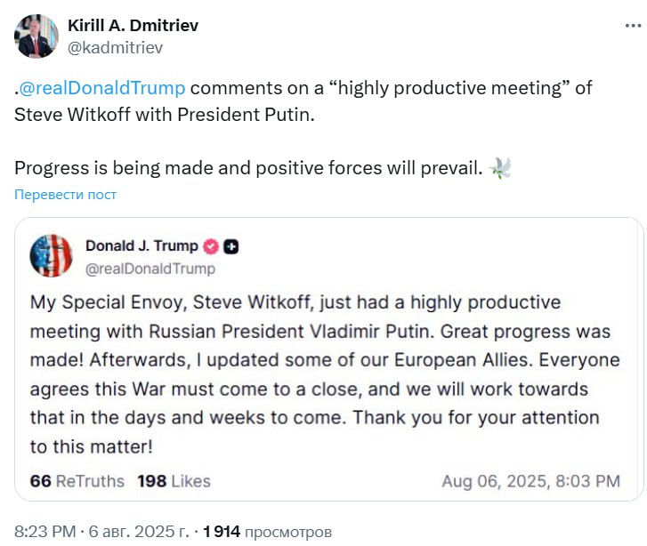 За словами спецпредставника Кремля з переговорів зі США Дмитрієва, заявлені Трампом «успіхи» в цих переговорах підтверджуються.