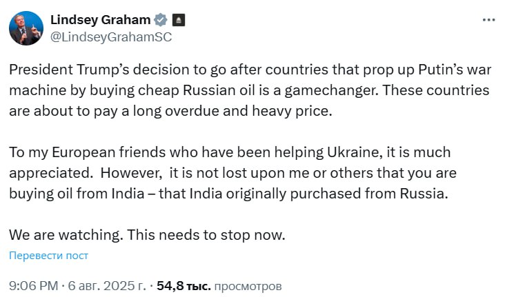 «Рішення президента Трампа чинити тиск на країни, які підтримують російську військову машину через закупівлю дешевої російської нафти, змінює правила гри. Ці країни повинні будуть заплатити давно назрілу та високу ціну. Мої європейські друзі, які підтримують Україну, викликають у мене велику вдячність. Однак ні я, ні інші не випускають з виду, що ви купуєте нафту в Індії, яку Індія спочатку закупила у Росії. Ми стежимо за ситуацією. Це необхідно припинити негайно», – написав він у Х.
