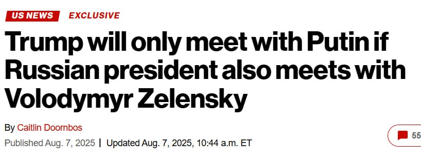 Президент США Дональд Трамп погодиться на особисту зустріч із Володимиром Путіним лише в тому разі, якщо російський лідер також проведе переговори з Володимиром Зеленським.