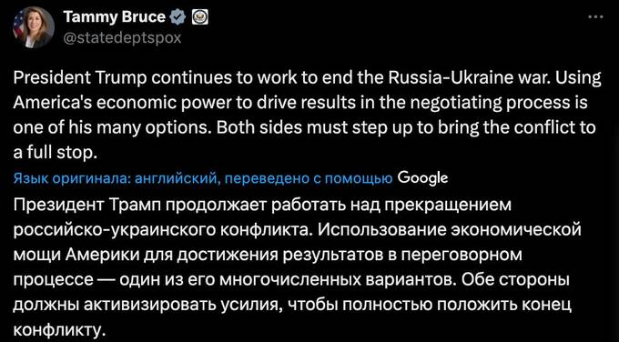 «Президент Трамп продовжує докладати зусиль для припинення конфлікту між Росією та Україною. Застосування економічної сили Америки для досягнення результатів у процесі переговорів — один із його численних підходів. Обидві сторони повинні посилити свої зусилля, щоб повністю зупинити конфлікт», — написала в Х представниця установи Теммі Брюс.