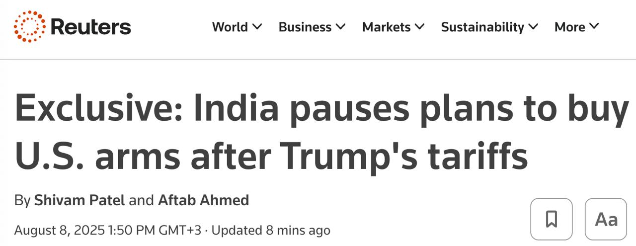 Індія відкладає плани щодо придбання американського озброєння і літаків через нові тарифи, запроваджені Трампом, повідомляє Reuters з посиланням на джерела.
