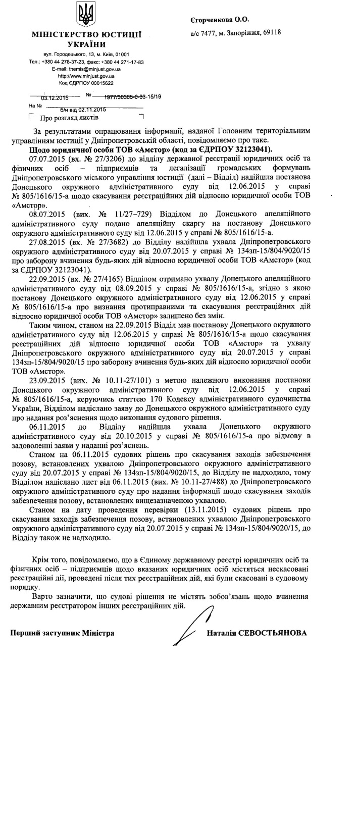 Суд рассмотрел иск, и своим постановлением от 08.09.2015 года все регистрационные действия и записи, произведенные в отношении ООО «Амстор» в период с 29.12.2014 по 14.05.2015 года, признал противоправными и отменил. Фемида также обязала Регистрационную службу Днепропетровского городского управления юстиции внести в Единый государственный реестр юридических лиц соответствующие записи об отмене указанных регистрационных действий. Документ вступил в законную силу 08.09.2015 года.