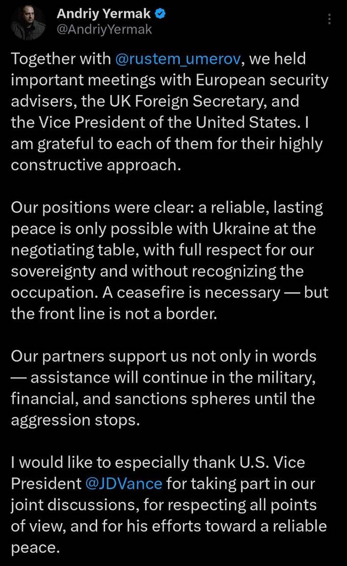 "Наша позиція однозначна: стійкий і міцний мир можливий лише за участі України в переговорах, з повною повагою до нашого суверенітету і без визнання окупації. Перемир’я необхідне — але лінія фронту не є кордоном", - написав керівник ОП.