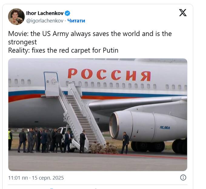 Меми про американських солдатів, які розстеляють Путіну килимову доріжку біля літака / Допис Ігоря Лаченкова у соцмережі Х