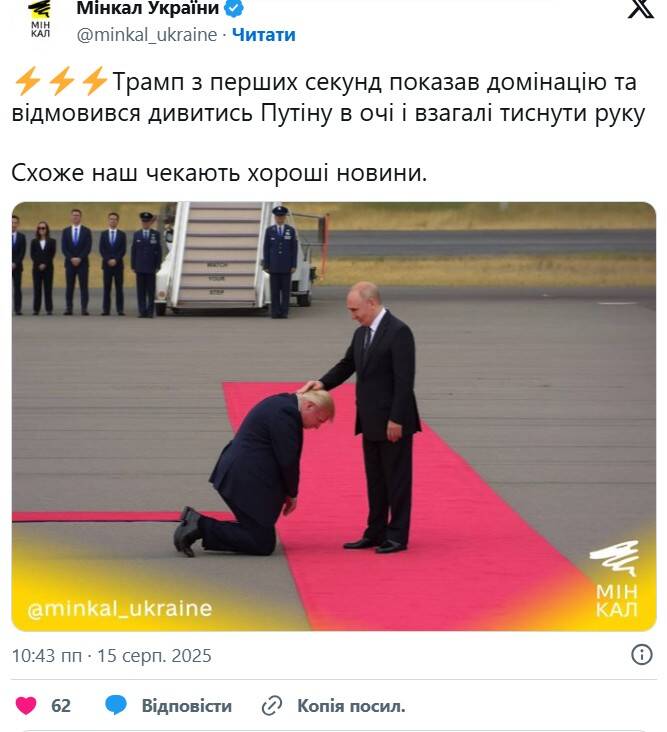 Дональд Трамп одразу показав Путіну "хто тут бос" / Допис з акаунту @minkal_ukraine у соцмережі Х