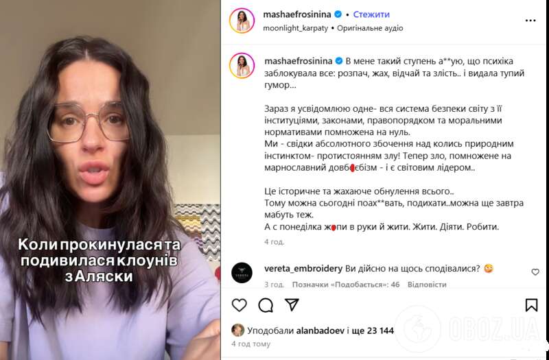 Українська ведуча Маша Єфросиніна опублікувала гнівний пост у своєму Instagram де, не підбираючи слів, написала, що після цього саміту дійшла до одного висновку – сьогодні "зло" стало світовим лідером.