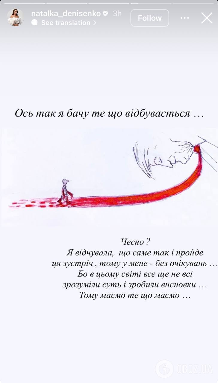 Своїми емоціями поділилася й акторка Наталка Денисенко. Вона опублікувала картинку, де Путін йде по краватці Трампа, символізуючи червону доріжку, і написала: "Чесно? Я відчувала, що саме так і пройде ця зустріч, тому у мене – без очікувань. Бо в цьому світі ще не всі зрозуміли суть і зробили висновки. Тому маємо те, що маємо".